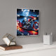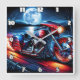A vibrant motorcycle adorned with the American flag speeds along a moonlit path, flames trailing as it glides past a tranquil lake surrounded by bare trees.