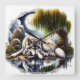 Beneath a luminous full moon, a majestic wolf lies in repose under the shelter of a weeping willow. The scene is mirrored perfectly in the glassy surface of a tranquil lake, inviting a moment of reflection and peace in the embrace of the night.