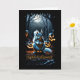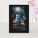This Halloween card presents a unique and whimsical scene perfect for those who enjoy a touch of nature in their holiday festivities. The focal point is an animated, slightly eerie squirrel, illuminated by the pale light of a full moon. The squirrel stands confidently in the centre, with its fur glowing slightly in the moonlight, creating a magical yet spooky effect.