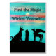 Watercolor. Silhouetted trio Dragon, Woman, UniPeg (unicorn-pegasus) on hilltop beneath a colourful moonlit sky, with saying: "Find the Magic Within Yourself"...