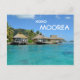 Postcard with luxury overwater thatched roof honeymoon bungalows in a resort on Moorea, an island near Tahiti in French Polynesia and the text: 'xoxo Moorea'.
