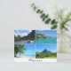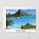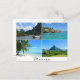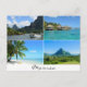 Postcard showing multiple landscapes with beach and jungle on the tropical, green island Moorea in the Tahiti archipelago French Polynesia in the Pacific Ocean with a white border and the text: 'Mo'orea'.