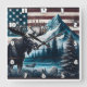 A majestic moose stands by a serene lake, framed by mountains and a backdrop of the American flag, capturing a sense of nature and patriotism.