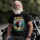 A large male moose stands tall in the forest as a man, wearing a funny hunting t-shirt, marvels at the majestic creature in their natural habitat.
