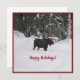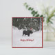 Moose in a Santa hat in the snow near a forest with "Happy Holidays" greeting on the front. This is a flat card, with the back empty to customise or sign.