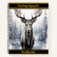A magnificent moose gazes directly, surrounded by snow-covered trees under a winter sky. The serene atmosphere captures nature's beauty.