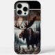 A majestic moose with large antlers stands in a snowy forest, its dark form contrasting against the white landscape.