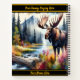 A solitary moose stands proudly beside a shimmering stream, surrounded by colourful autumn foliage and towering mountains, evoking a serene and picturesque wilderness experience.
