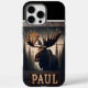 A large moose with impressive antlers is depicted on a wood panel, against a backdrop of a forest and a cloudy sunset. The name Paul is written in large lettering at the bottom of the panel.