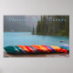 A row of colourful canoes sits on a wooden dock, facing a serene Moraine Lake, Canada, surrounded by lush green trees. The water is a vibrant turquoise blue, reflecting the overcast sky. The background features a misty mountain range, adding a sense of tranquillity to the scene.