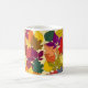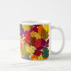 This mug has a design of a pile of leaves in green, yellow, orange, blue, brown, and red on a field of pale yellow.