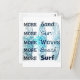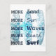 Fun print features all the things beach lovers want : MORE beach, sun, sand, waves and surf. Shades of blue with trio of surboards in background.