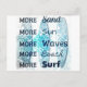 Fun print features all the things beach lovers want : MORE beach, sun, sand, waves and surf. Shades of blue with trio of surboards in background.
