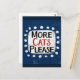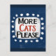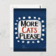 "More Cats Please" is a cute text design in blue with black and red text, along with a white accent shape and white textured whimsical dots surrounding it.