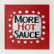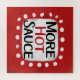 "More Hot Sauce" is a cute text design in red with black and red text, along with a white accent shape and white textured whimsical dots surrounding it.