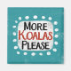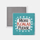 "More Koalas Please" is a cute text design in blue with black and red text, along with a white accent shape and white textured whimsical dots surrounding it.