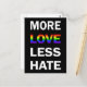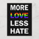 More Love Less Hate Postcards with a bold white text on a black background, and a rainbow pattern in the word love.