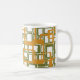 This mug has a mid-century modern design of open rectangles in gold over open rectangles in green.