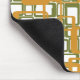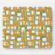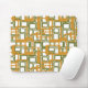 This mouse pad has a mid-century modern design of open rectangles in gold over open rectangles in green.