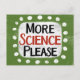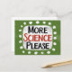 "More Science Please" is a cute text design in green with black and red text, along with a white accent shape and white textured whimsical dots surrounding it.