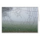A spider web outlined in morning dew almost appears to be spun glass. The foggy field in the background shows through her web.