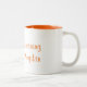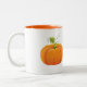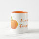 Coffee mug is shown with a fall pumpkin art print. Morning Pumpkin text