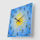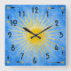 This cheerful wall clock will bright any room you hang it in! Bright yellow sunburst against a blue mosaic sky with subtle polka dot shadow, craftsman style corners feature yellow daisy & black arrows. The hours are marked with black Rennie MacIntosh style numerals.