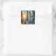 Pretty comic book pop art style woman sitting in a city window holding a coffee cup looking out over the city skyscrapers as the sun rises while her cat naps next to her.