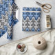 Wrapping paper in a Moroccan inspired damask pattern of interlocking positive / negative fleur-de-lis shapes with a striated, Ikat woven texture - dark navy and medium cerulean blue with dark and light grey / grey
