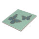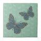 The wings, body, and antennae of a monarch butterfly are adorned with patterns found in mosaics and carvings found in the buildings and decorative items from Morocco. Blue, green, gold, white, and a rich red brown paint these geometric and floral inspired patterns, bringing in colours that are prominent and important in Moroccan artwork. This tile can be framed to create a trivet or placed inside a wooden gift box lid. Tiles without a frame will also fit inside the large gift box to create a matching set.