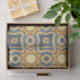 Moroccan tile design in blues and yellows decoupage tissue paper, 18 lb, 20x30 size. Great for furniture up-cycling.
