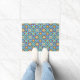 Moroccan tiles design gives an exotic flair to this doormat patterned in shades of teal, blue and terracotta