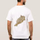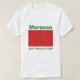 An editable title and slogan accompanies the green five pointed star on a red background of the Moroccan flag on the front of this t-shirt. The back displays a detailed map of Morocco.