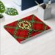 Clan Morrison crest badge surrounded by a strap and buckle over red tartan background. Custom front, back and spine text.