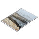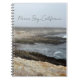 A foggy overcast day in Morro Bay California with the ocean waves hitting the rocks on the shore in this beach photograph souvenir. This seaside travel photo keepsake notebook gift features black cursive script above the beach rocks and grey sky.
