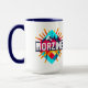 A bold Morzine mug featuring a striking geometric mountain design with vivid alpine colours, sunburst detail and strong resort-style lettering. Printed on both sides of a white mug with a navy handle and navy interior, this design has a lively ski-town feel that suits coffee at home, in the chalet or after a day on the slopes. A great gift for skiers, snowboarders and mountain lovers with a connection to Morzine and the French Alps.