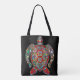 Mosaic sea turtle in jewel tone colours of red, green, blue and gold on a black tote. I offer the matching flipflops.
