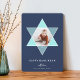 Elegant and modern Hanukkah photo card features a favourite photo set inside a Star of David accented with bright shades of blue for a unique mosaic effect, on a rich navy background. "Happy Hanukkah" appears beneath in modern, clean white and pale grey lettering. Personalise with your names along the bottom,and add two additional photos and a personal message to the back.