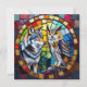 A stained glass mosaic style ai illustration of a wolf with blue eyes and an owl. Vibrant and colourful ai illustration of wildlife.