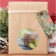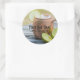 Restaurant, bar, tavern business custom template sticker. Three inch round sticker (or choose the smaller size) featuring a picture of a Moscow Mule drink in a copper mug. Add a business name and phone number or address using the two lines of example, template text in black.
