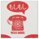A retro illustration of a telephone with a dial. This 70's or 80's themed phone has a vintage look with a cord and dial. The text reads Moshi Moshi. A common phone reading in Japan. The design has Japanese Kanji Characters.