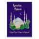 A stylish Ramadan Greeting Card 'From Our Home to Yours' with a moonlit mosque on a deep blue background, and 'Ramadhan Mubarak'; from a watercolour painting by Judy Adamson.