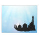 Black silhouette of a mosque on a blue sky with sun and sunrays.