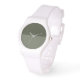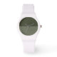 This moss green custom watch combines timeless style with flexible utility, designed to serve everything from personal milestones to large-scale bulk orders. The face features a unique split design: one half in solid moss green, the other in a matching hue with a subtle noise texture that mimics the look of natural stone. The clean white strap brings balance, creating a watch that feels both grounded and modern.