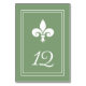 Elegant and simple Wedding Table Card featuring a fleur de lis against a moss green background. This design is a unique choice for a modern wedding. Easy to customise with the appropriate table number(s). Click "Customise It" to find more personalisation options.