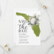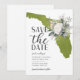 Moss green Florida destination wedding save the date with a floral US state illustration.