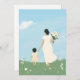 A serene illustration of a mother and child walking hand-in-hand through a vibrant meadow filled with white flowers. The mother, dressed in a flowing white dress, holds a bouquet of daisies, symbolising love and purity. The bright blue sky with soft clouds adds to the peaceful and joyful atmosphere.