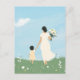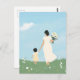 A serene illustration of a mother and child walking hand-in-hand through a vibrant meadow filled with white flowers. The mother, dressed in a flowing white dress, holds a bouquet of daisies, symbolising love and purity. The bright blue sky with soft clouds adds to the peaceful and joyful atmosphere.