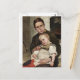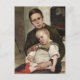 A 19th century mother in severe homespun dress holds her baby boy with fireplace and cooking area in background. Vintage fine art by Swedish painter Gerda Tiren.