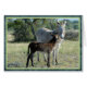 Photo of sweet interaction between mother burro and baby. Decorative green borders and light green inside.